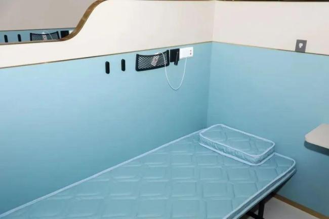 休息区域将单人躺椅升级为单人床铺,并在床铺间设置了隔断与床帘,提高了私密性。每个床铺还配备了充电口、阅读灯等设施,并安装了求助按钮以保障安全。休息室位于P3停车场的负一层,开放时间为晚上10点到次日早上9点,凭当日或次日车票及身份证即可免费入住,有专人值守。