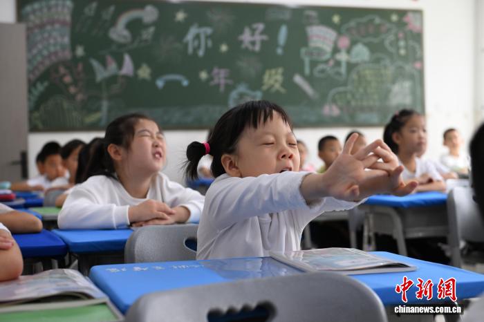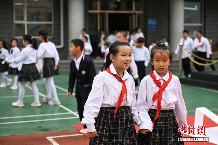 9月1日,呼和浩特市玉泉区公义店小学,小学生在课间放松。当日,呼和浩特市幼儿园、小学、初中、中等职业学校及普通高中高一、高二年级开学。中新社记者 刘文华摄
