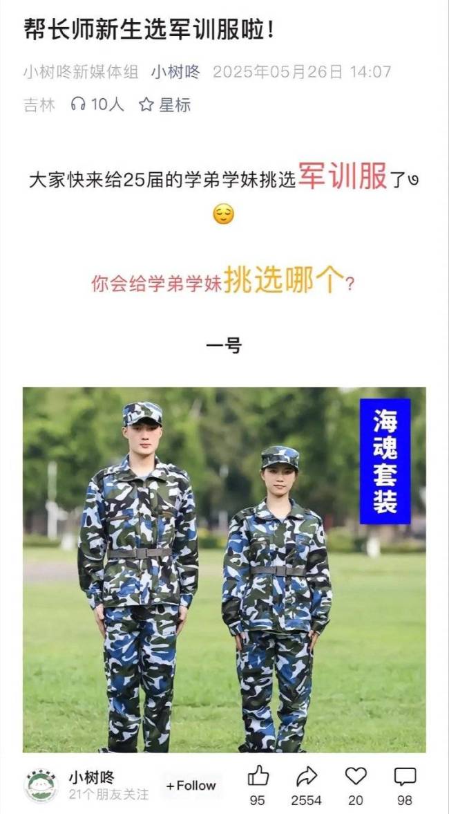搜索发现,这篇关于军训服装投票的文章现已不可见。该文章于今年5月26日发布,标题为“帮长师新生选军训服啦!”,包含了五款军训服,其中第五款是网传的红色款式,吸引了超过250万网友投票。文章发布者为“小树咚”,这是一个由长春师范大学学生创办的公众号,专注于提供校园生活服务信息。