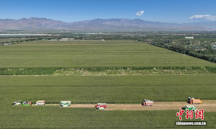 9月5日,工作人员在宁夏农垦集团有限公司平吉堡农场收割青贮玉米。当前,正值青贮玉米收获关键期,宁夏各地抢抓农时,组织农机服务队和农技人员深入田间地头,全面开展玉米青贮工作,为牲畜安全越冬备足“营养餐”。(无人机照片)中新社记者 于晶 摄