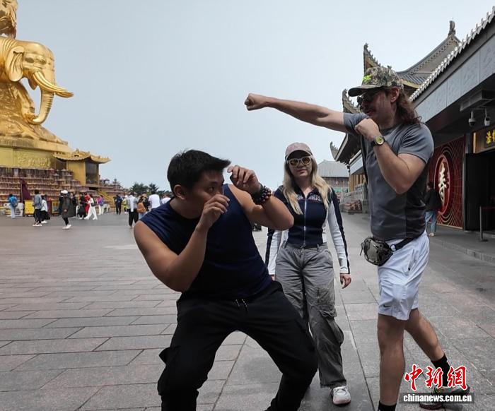 美国网络视频博主布拉德·波德雷(Brad Podray)和朋友一起,模仿着中国武术的样子,正拍摄短视频。他听闻峨眉山顶有武术表演,毫不犹豫决定前去,并对记者说:“中国功夫表演,为什么不(去看呢)?”