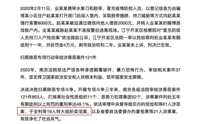 关于于全利团伙被捕的情况,记者查询发现,南京市中级人民法院曾在2020年工作报告中提到,开展专项斗争三年来,南京各级法院审结涉黑恶案件121件853人,打掉黑社会性质组织11个、恶势力犯罪集团52个,涉黑案件判处五年有期徒刑以上刑罚的重刑率达49.1%。