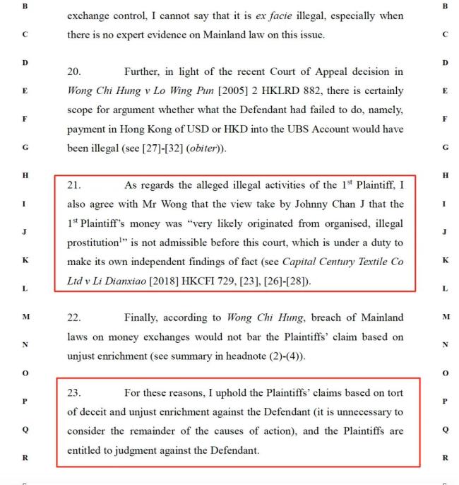 不过关于于全利的资金来源问题,法院认为资金“极可能源自有组织的非法卖淫活动”的见解不可采纳,并支持于全利针对孙健荣提出的欺诈和不当得利的侵权主张。