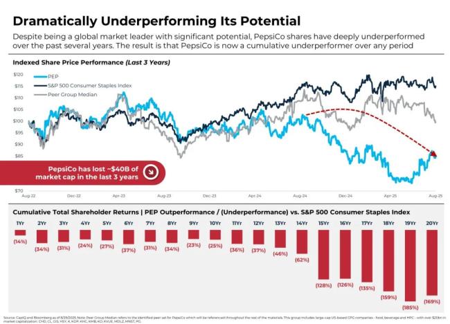 “百事公司是一家世界级公司,拥有标志性品牌和无与伦比的全球影响力。然而,该公司面临的战略和运营挑战导致财务业绩不佳、股价大幅跑输市场,并且估值明显被低估。”Elliott在报告中指出。