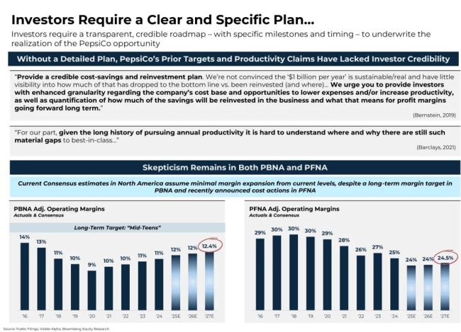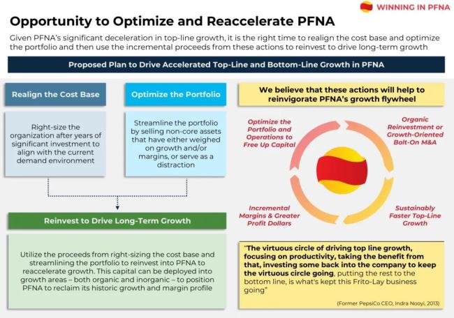 第二,Elliott同样建议,PFNA精简产品组合,剥离非核心及表现不佳的资产。同时,其提到,百事公司应进行运营审查,重点是使PFNA的成本与当前的销量相符。