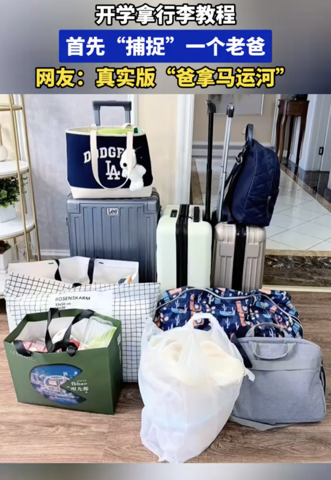 开学季著名景点:“爸拿马运河”。9月开学季,有网友分享自己的开学拿行李教程,首先“捕捉”一个老爸,网友调侃称:“爸拿马运河”。