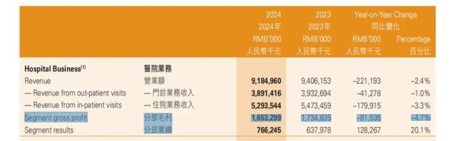 进一步来看,尽管2024年华润医疗努力通过提质增效降低次均收入下降对医院业务利润的影响,但医院业务分部毛利下降4.7%,毛利率至18.0%。