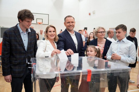 6月1日,独立候选人卡罗尔·纳夫罗茨基(左三)和家人在波兰首都华沙一处投票站投票。新华社发(亚普·阿林摄)