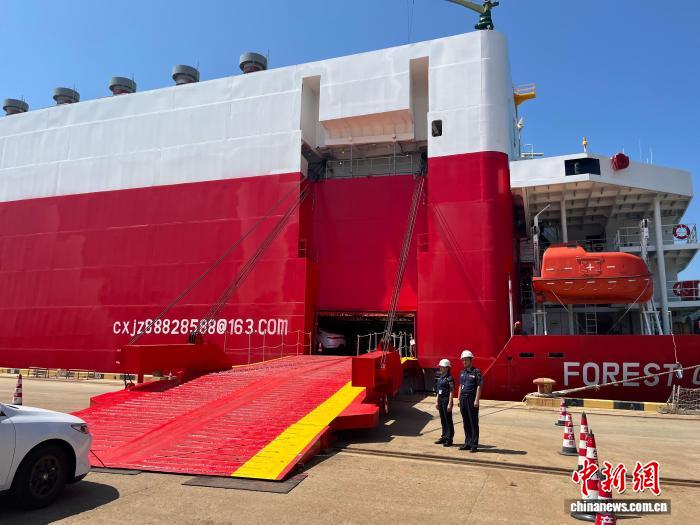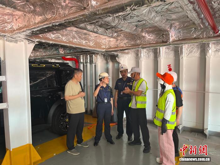 图为海事部门工作人员在现场进行保障工作。为保障航线顺利开通和滚装船首航成功,温州海事部门联合多家单位,制定“一船一策”保障方案,开辟24小时“优先查验”绿色通道,实施“远程预检+登轮检查”等,全方位保障船舶运输安全。浙江海事局供图