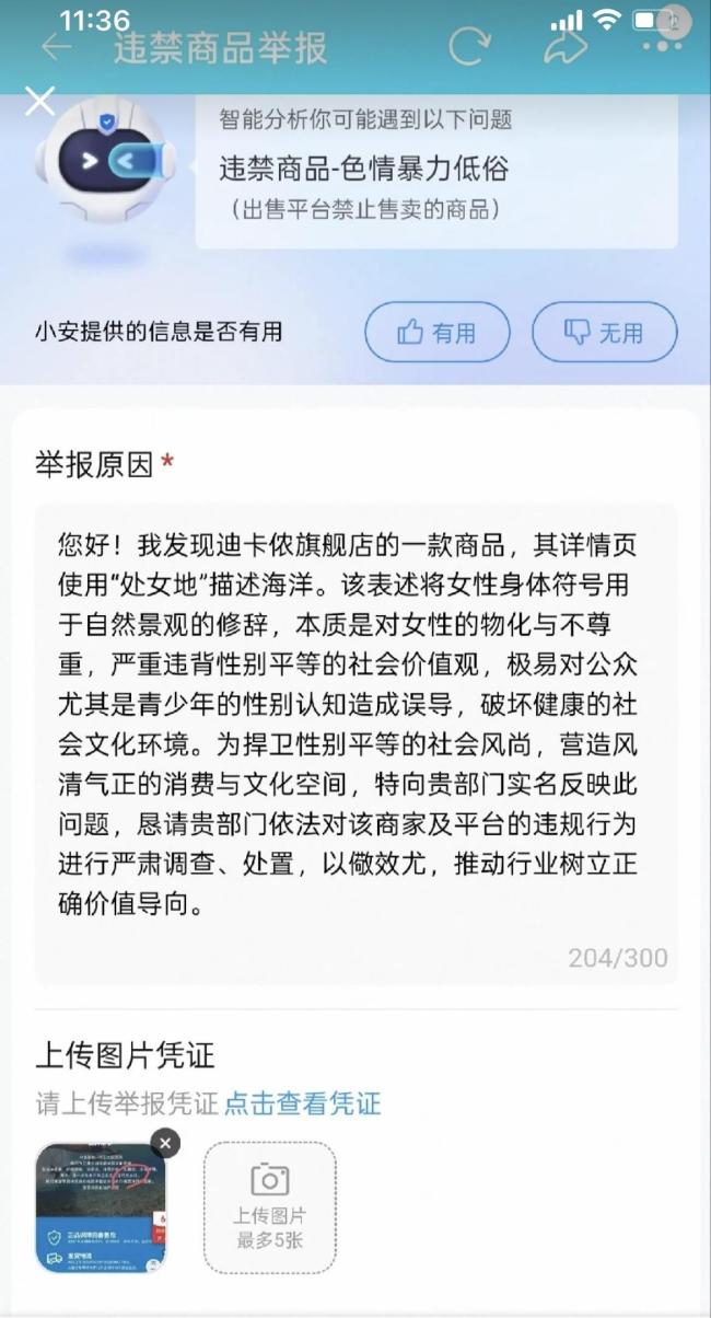 随后,迪卡侬客服回应称公司已注意到网友的争议,并已将相关广告文案撤除。此前,迪卡侬在平台上展示一款水母潜水泳衣时,使用了如下文案:“海洋,是一块尚未开发且无边无际的处女地,我们希望帮助冲浪的你或即将体验冲浪的你探索冲浪的奥秘。”