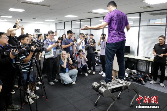 在济南优宝特机器人,记者们现场体验式采访了人形机器人“行者泰山”、四足机器人等。外国记者还站上四足机器人,亲自感受机器人承重实验。