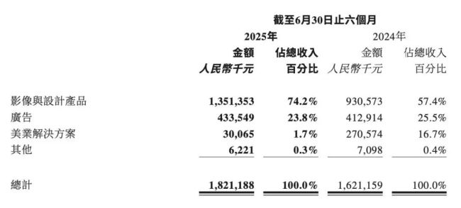 值得一提的是,随着美图公司将战略重心聚焦于核心影像与设计产品业务,其早期的主要收入来源——广告业务在总营收中的占比正持续下降。