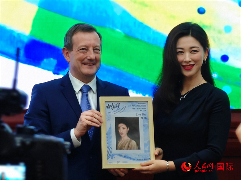9月22日,法国驻华大使白玉堂(左)为中国演员朱珠(右)颁发“第十二届中法环境月推广大使”称号。人民网 李慧妍摄