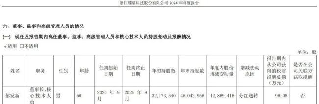 2025年半年报显示,截至报告期末,郁发新持股数量约为4500万股,持股比例为21.04%,持股市值约为27.4亿元。