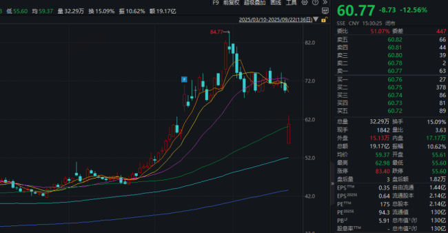 臻镭科技股价今年以来涨幅超70%。截至9月22日收盘,臻镭科技股价为60.77元/股,总市值130亿元。8月底,公司股价盘中刷新上市以来新高,达到84.77元/股。