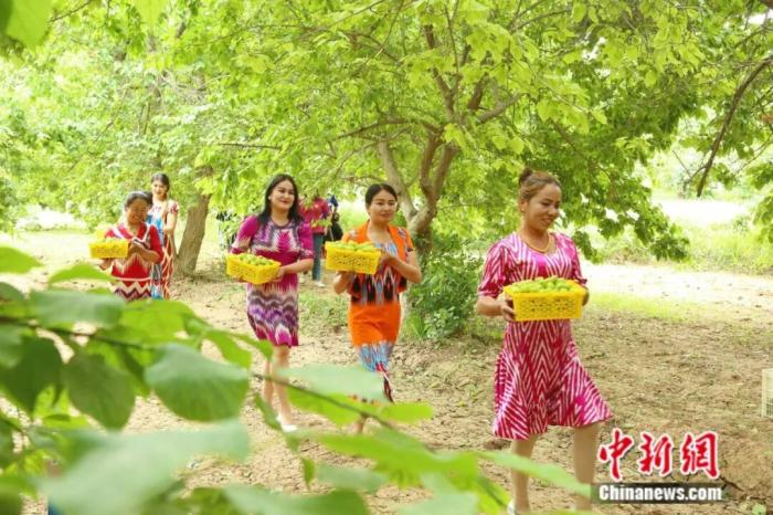 库车市每年举行小白杏采摘节庆活动,当地民众展示小白杏。王小军 摄
