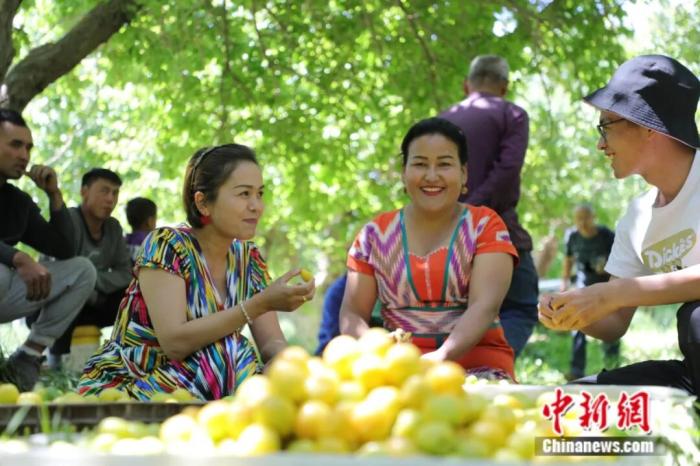 小白杏丰收,民众品尝。库车市融媒体中心供图
