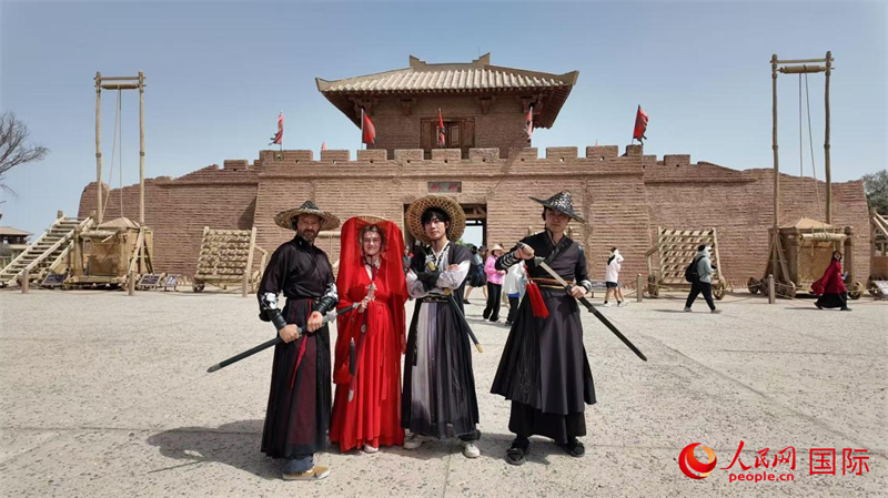 意大利艺术家马泰奥、罗马尼亚艺术家安德烈娅与中国艺术家吴穹等体验中国传统服饰。人民网 严小晶摄