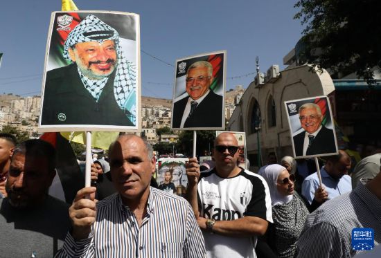 9月23日,在约旦河西岸城市纳布卢斯,民众挥舞巴勒斯坦领导人阿拉法特和阿巴斯画像参加庆祝活动。新华社发(尼达尔·艾仕塔耶摄)