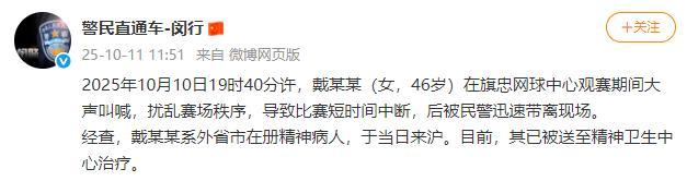 警方通报女子网球赛现场大喊大叫 精神病人已被带离治疗!10月11日,上海市公安局闵行分局发布通报称,10月10日19时40分许,一名46岁的女子戴某某在旗忠网球中心观赛期间大声叫喊,扰乱了赛场秩序,导致比赛短时间中断。民警迅速将她带离现场。经调查,戴某某是外省市在册的精神病人,当天来到上海。目前,她已被送至精神卫生中心治疗。