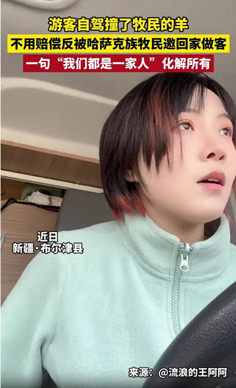 女子撞羊反被牧民邀请吃羊肉 善良温暖人心!近日,在新疆布尔津县,一名游客自驾时不慎撞到了牧民的羊。然而,这位哈萨克族牧民不仅没有要求赔偿,反而邀请游客回家做客,一句“我们都是一家人”化解了所有尴尬。无数网友被这位善良的牧民感动,但也有质疑声出现——“这又是剧本吧?”