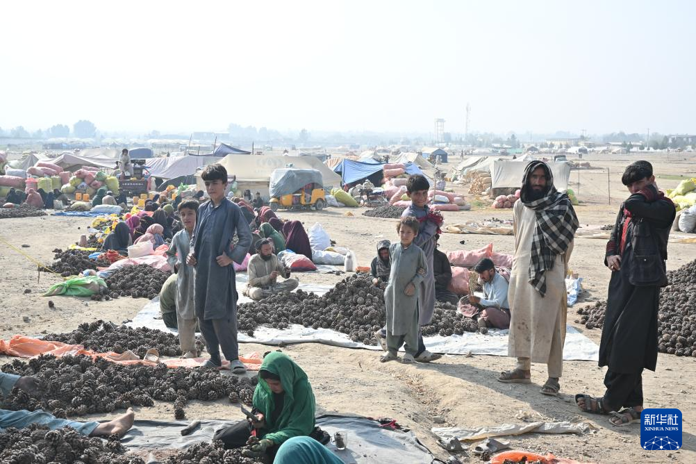 这是10月28日在阿富汗霍斯特省拍摄的松子加工交易市场。用木棍将松子从松塔中敲出来是当地人采集松子的方式。 新华社记者 张艺缤 摄