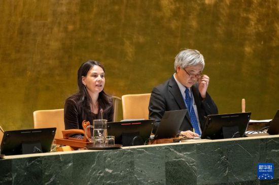 11月12日,在位于纽约的联合国总部,第80届联大主席贝尔伯克(左)主持会议。新华社发(联合国供图/埃万·施奈德摄)