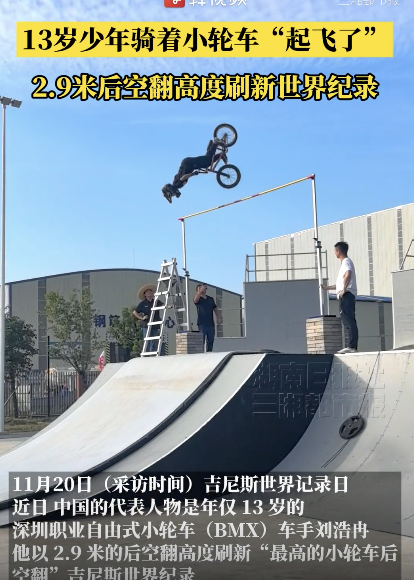 13岁少年骑着小轮车“起飞了” 挑战吉尼斯世界纪录。11月20日,吉尼斯世界记录日。近日,年仅13岁的深圳职业自由式小轮车(BMX)车手刘浩冉他以2.9米的后空翻高度,刷新“最高的小轮车后空翻”吉尼斯世界纪录,打破了由英国选手Ben Wallace自2010年以来保持的纪录。