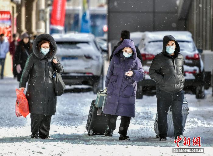 12月11日,一夜降雪后,新疆乌鲁木齐市气温骤降10℃至15℃左右,外出市民穿着厚衣御寒。受强冷空气影响,12月10日该市出现强降雪及大风天气,气象部门相继发布寒潮和暴雪预警信号。中新社记者 刘新 摄