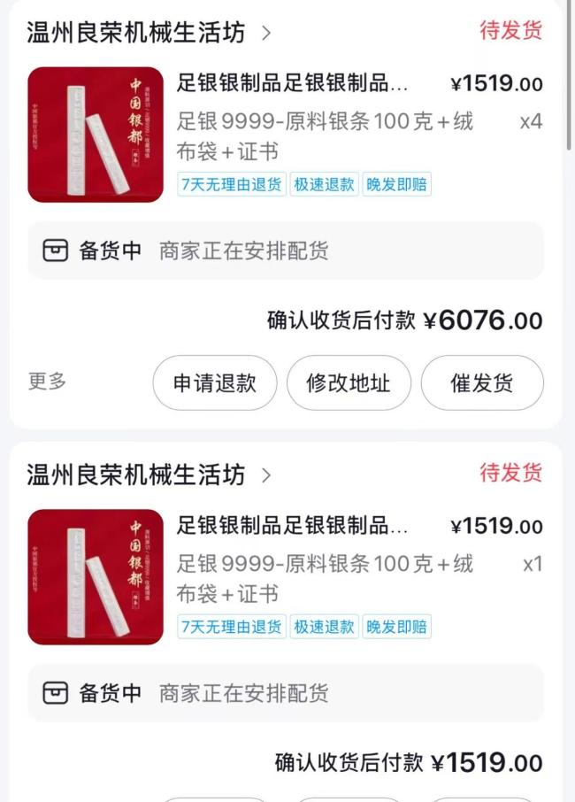 在平台购买银条后,徐先生遇到了一系列问题。12月25日,他在某平台的“温州良荣机械生活纺”店铺分四笔订单购买了2400克白银,共花费36836元。然而,下单后的第二天,店铺清空了所有商品,且人工客服联系不上。到了发货时间,商家仍未发货。徐先生表示,他购买时每克白银价格为15.19元,周末涨到了20.1元,而12月31日查询的价格为每克18.14元。