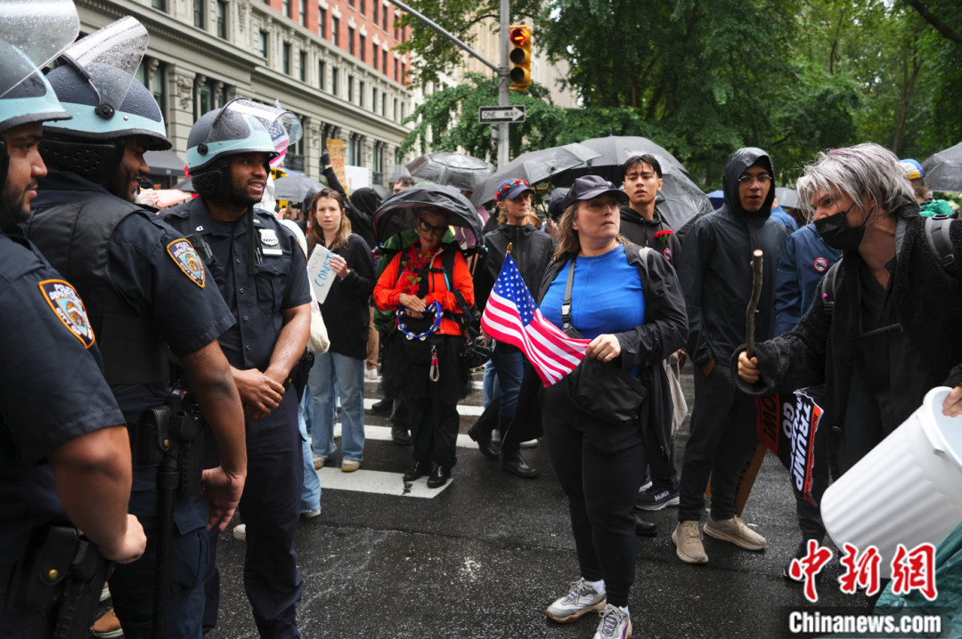 当地时间2025年6月14日,美国多个城市举行名为“没有国王”(No Kings)的抗议活动,表达对政府政策的不满。图为纽约第五大道的抗议者与警察。 中新社记者 廖攀 摄