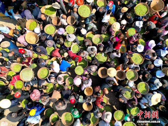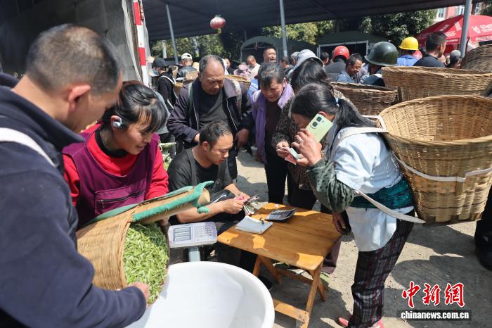 3月11日,在四川省雅安市名山区双河鲜叶交易市场和红星镇鲜叶交易市场内,随着正式开市,市场内人头攒动,呈现出购销两旺的场景。中新社记者 张浪 摄