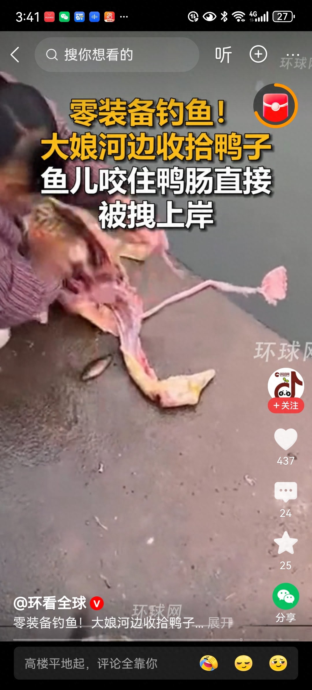 大娘河边收拾鸭子,鱼竟咬住鸭肠被拽上岸!网友:“佛系”钓鱼法