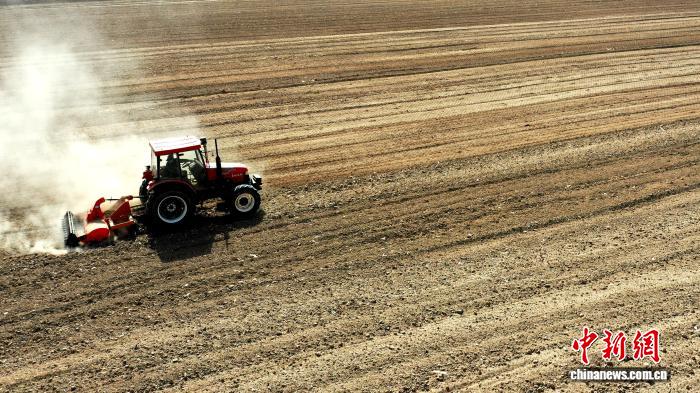 3月底,甘肃省武威市民勤县大型农机在高标准农田里穿梭作业,助力春耕生产。马爱彬 摄