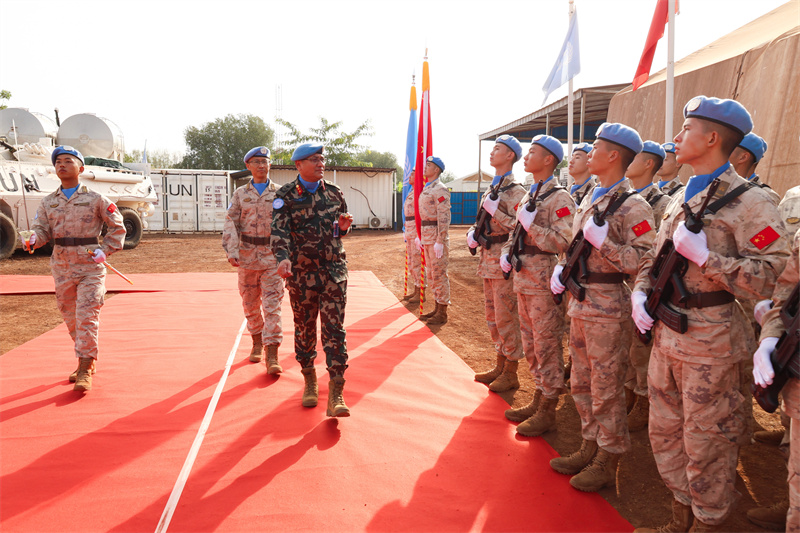 授勋仪式在雄壮的国歌中拉开序幕,全场嘉宾面向国旗敬礼。分队队长张海涛和联阿安全部队特派团代理团长兼部队司令甘尼什·库马尔·什雷斯塔少将随后检阅中国维和快反分队。3支方队迈着整齐的步伐依次通过观礼台,中国维和官兵英武挺拔的军姿、整齐划一的队列赢得现场嘉宾阵阵掌声。