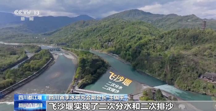 四川省李冰研究会副会长 王国平:丰水期的时候,六成江水进入外江泄洪,四成江水进入内江灌溉;而到了枯水期的时候,则有六成江水进入内江,保证成都平原的用水安全,只有四成江水进入外江,这就是著名的“四六分水”。鱼嘴建在弯道上,江水冲击弯道,产生离心力,让含沙石较少的表层水流入内江,让含沙石较多的底层水流入外江,进入内江的沙石大约百分之二十,进入外江的沙石大约百分之八十,这就是著名的“二八排沙”。“四六分水”和“二八排沙”完美地解决了治理水患的两千两百多年的世界级难题——泄洪和排沙。