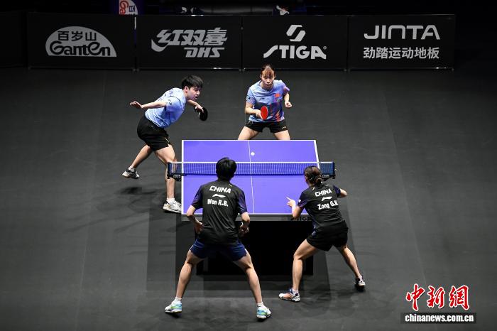 4月9日,2026年世界乒乓球职业大联盟(WTT)常规挑战赛太原站正赛在太原市滨河体育中心体育馆开赛,来自19个国家和地区的近百名选手向400点世界排名积分发起挑战。图为中国选手黄友政(左上)/石洵瑶(右上)对阵温瑞博(左下)/纵歌曼(右下)。中新社记者 韦亮 摄