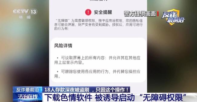 北京警方通过调查发现,这些色情软件在下载安装时会诱导用户启动“无障碍权限”,这是诈骗分子能够远程操控受害人手机的关键。“无障碍权限”是为了方便老年人操作或软件工程师调试软件时使用的。正常通过应用商城下载的软件绝大多数不需要开通无障碍权限。一旦开通了无障碍权限,就相当于把手机交付给了对方。