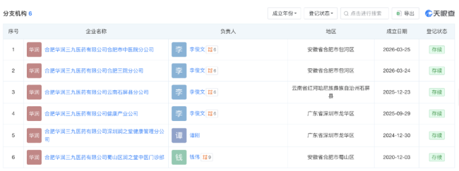 穿透股权结构来看,合肥华润三九医药有限公司的控股股东为华润三九现代中药制药有限公司。目前,合肥华润三九医药下有6家分支机构,均处于存续状态。
