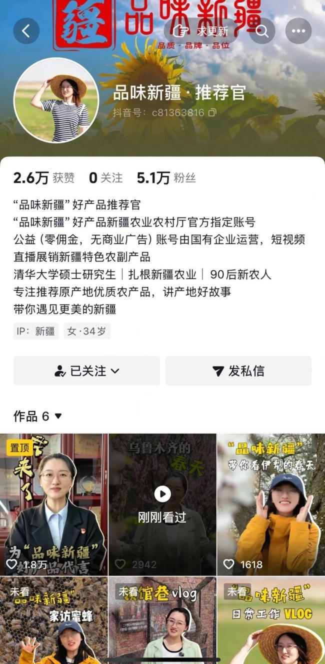 接棒贺娇龙后,清华毕业生发声 专注新疆农特产推广。蔡宜芮来自新疆维吾尔自治区农业农村厅,她在“品味新疆·推荐官”账号上发布了一条视频,介绍自己将陪伴大家认识真正的新疆地道农特产。这条视频于4月14日发布,但起初并未引起太多关注。直到4月19日,“贺娇龙 品味新疆”账号发布了一份公告,解释了贺娇龙账号及新开通账号的情况,这才让更多人注意到“品味新疆·推荐官”账号和蔡宜芮。