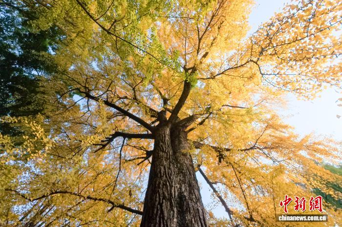 四川眉山:古祠金叶舞 诗意醉游人 11月24日,初冬暖阳下,四川省眉山市东坡区纱縠行南街的三苏祠博物馆南门内,高大的银杏树渐染金黄,金黄叶片随风轻舞,吸引不少游客驻足观赏、拍照留念,现场洋溢着浓浓的诗意与雅致氛围。图为三苏祠内上百年的古银 11-24