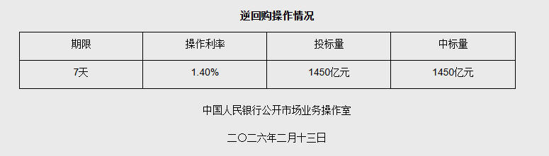 2月13日央行开展1450亿元7天期逆回购操作 中新网2月13日电 据央行网站消息,2026年2月13日中国人民银行以固定利率、数量招标方式开展了1450亿元7天期逆回购操作。具体情况如下: 02-13