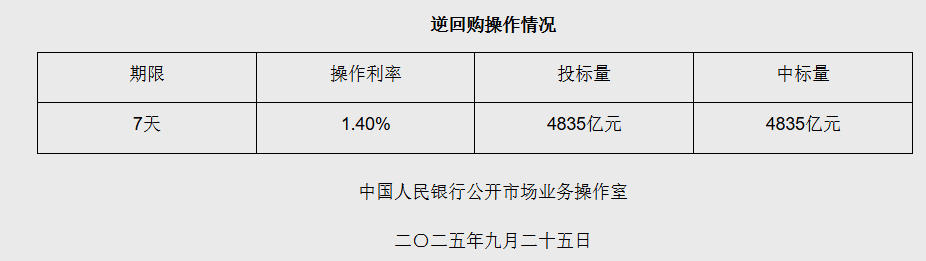 9月25日央行开展4835亿元7天期逆回购操作 中新网9月25日电 据央行网站消息,2025年9月25日中国人民银行以固定利率、数量招标方式开展了4835亿元7天期逆回购操作。具体情况如下: 09-25