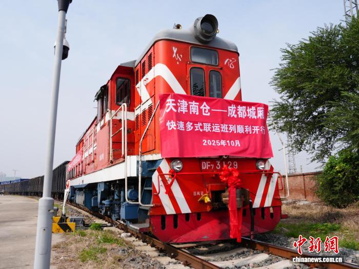 天津南仓至成都城厢快速多式联运班列成功首发 中新网天津10月15日电 (记者 王君妍 通讯员 董策 李杭)记者从中国铁路北京局集团有限公司(简称:国铁北京局)获悉,10月15日上午,一列满载磷酸铁、汽车配件、日用百货等白货的货物班列从国铁北京局天津铁路物流中心南 10-15