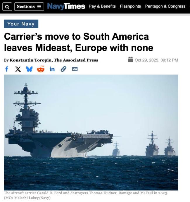 美军航母频现“真空期” 中东海域无航母部署 美国《海军时报》报道,以色列与哈马斯互相指责对方违反停火协议之际,美国政府将“福特”号航母从地中海撤出,部署到拉美周边水域执行打击贩毒任务。这一调动让美国面临罕见局面,即仅有一艘航母处于部署状态,且在欧洲和中东附近海域均无航母部署 11-03