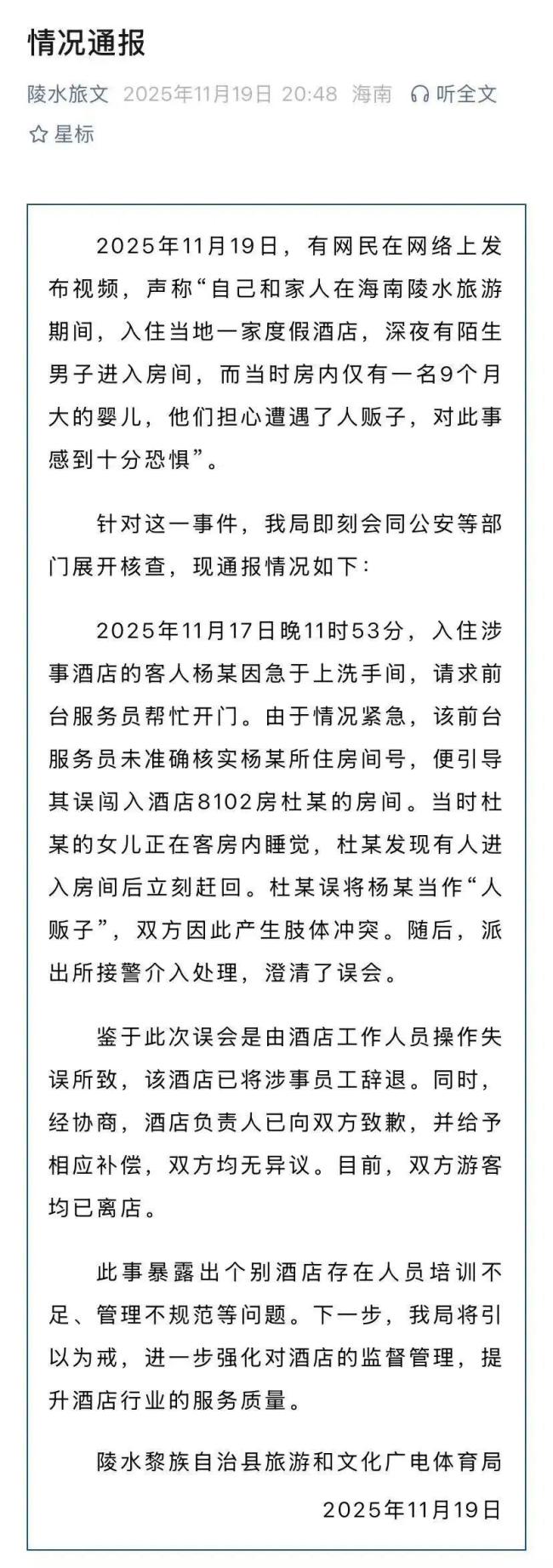 官方通报陌生人闯入熟睡婴儿房间 误会澄清已妥善处理 11月19日,海南陵水黎族自治县旅游和文化广电体育局通报了一起事件。有网民发布视频称,在海南陵水旅游期间,入住当地一家度假酒店时,深夜有陌生男子进入房间,当时房内仅有一名9个月大的婴儿,他们担心遭遇了人贩子,对此事感到十分恐惧 11-20