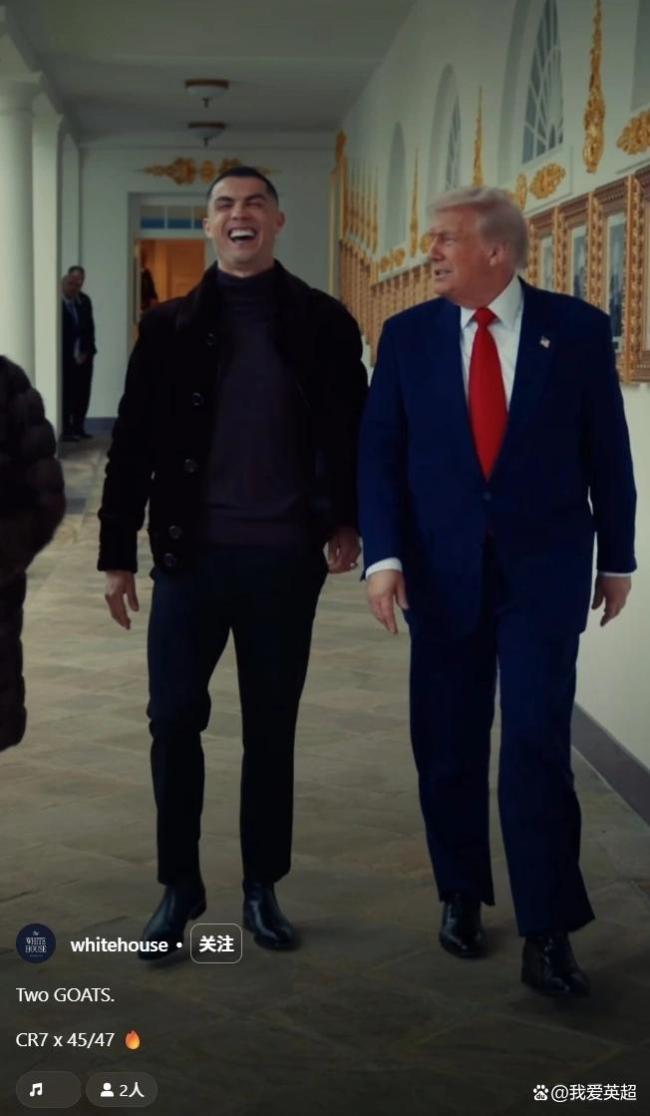 C罗随特朗普参观白宫开怀大笑 两GOAT相谈甚欢 北京时间11月19日晚,白宫和C罗官方账号联合发布了一段视频,展示C罗与美国总统特朗普在走廊散步的情景。配文称:“Two GOATS(两个历史上的最佳)”。视频中两人谈笑风生,C罗不时咧嘴大笑并鼓掌,未婚妻乔治娜则在一旁微笑陪伴 11-20