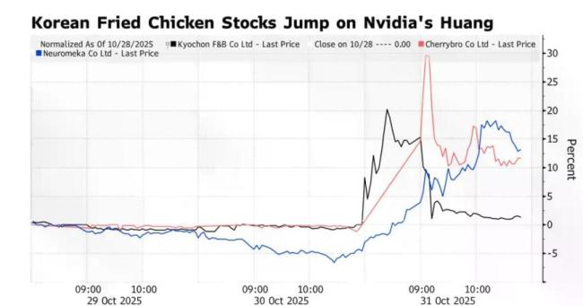 英伟达CEO黄仁勋外出活动推高韩国炸鸡股股价 网红效应带动股市 北京时间10月31日,英伟达CEO黄仁勋与三星电子会长李在镕、现代汽车执行会长郑义宣在韩国一家名为Kkanbu Chicken的炸鸡连锁店共饮啤酒 10-31