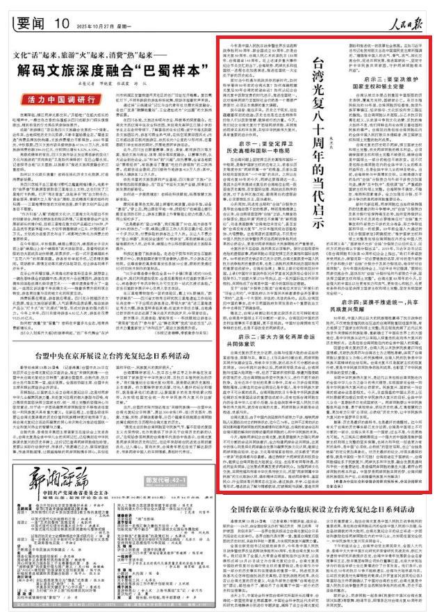 多家央媒就台湾前途命运密集发声 共促统一大业 今年是中国人民抗日战争暨世界反法西斯战争胜利80周年、联合国成立80周年,也是台湾光复80周年、台湾人民乙未武装抗日130周年、台湾建省140周年 10-27