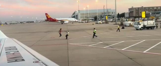 男子登机前绕着飞机跑被警方抬走 涉及其他案件处理中 9月22日晚,一位北京网友发布视频称,在乘坐国航CA1107航班时,一名男子在停机坪上疑似闹事被机场警方控制。视频显示,这名男子在停机坪上奔跑,后面有警务人员追赶。尽管警方多次警告,该男子仍绕着飞机跑动,最终被四名民警控制并抬走 09-24